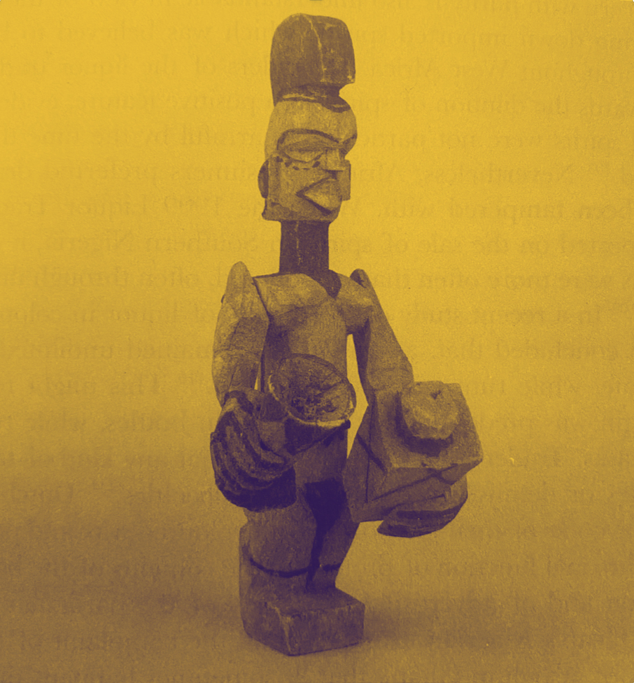 Ibibio canoe charm, featuring a figure carrying a gin bottle. 1905. Artist, and photographer unknown.